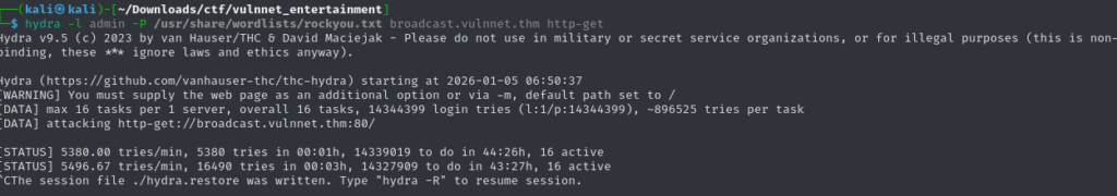 I briefly considered brute-forcing the login on the broadcast subdomain using Hydra, but once I saw how slow it would be — and with no confidence in the username — I decided not to tunnel-vision on it.
