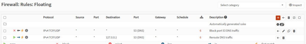 To enforce DNS usage, I created floating firewall rules: